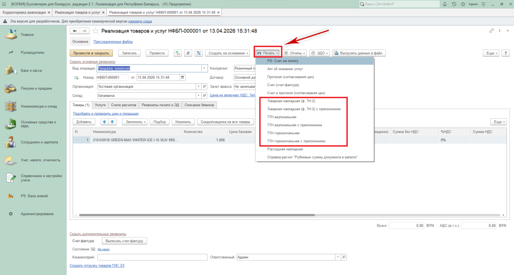 ТН, как и ТТН, можно распечатать из документа реализации по кнопке «Печать».
