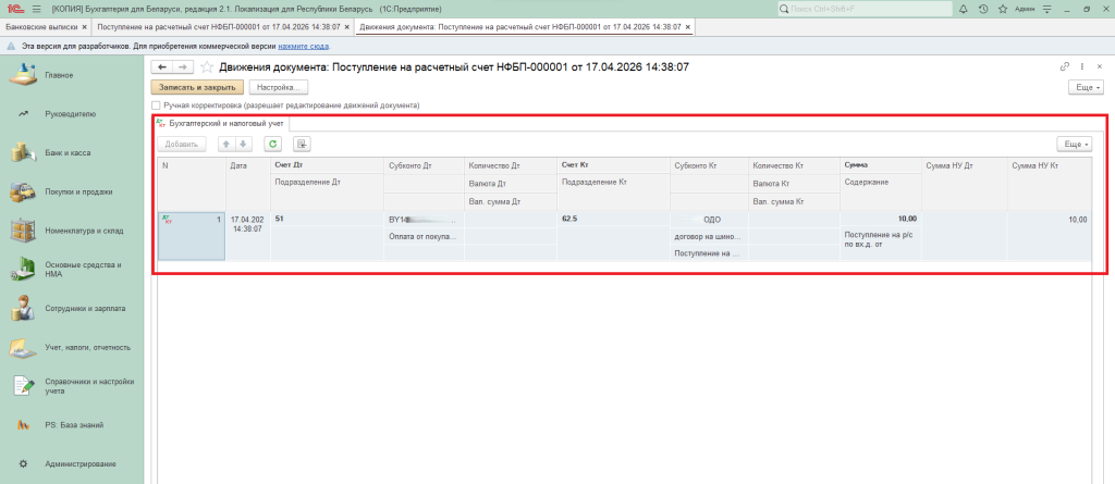 Проводим документ и по кнопке Дт/Кт посмотрим на сформированные программой проводки.