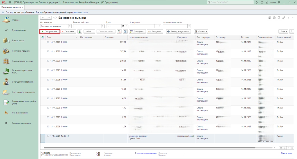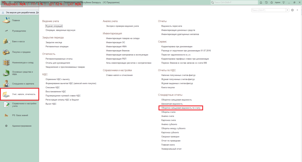 Перед оформлением поступления рекомендуется проверить актуальную задолженность покупателя перед вашей компанией. Для этого перейдите: раздел «Учёт, налоги, отчётность» → «Стандартные отчёты» → «Оборотно-сальдовая ведомость по счёту».