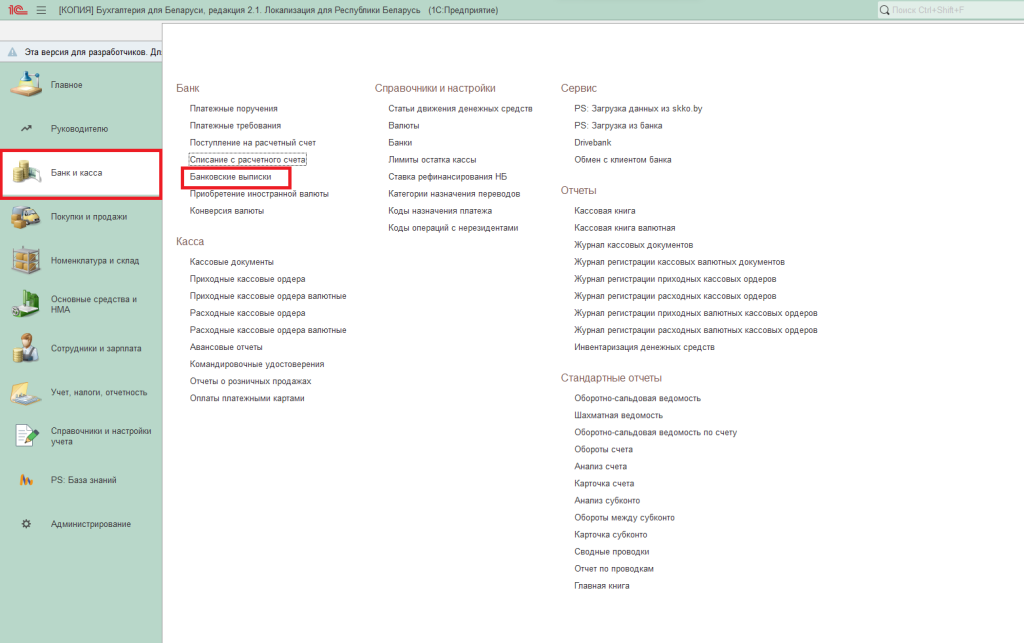 Для отражения безналичной оплаты, которая поступила от покупателя на расчетный счет организации, заходим в раздел «Банк и касса» — «Банк» — «Банковские выписки».