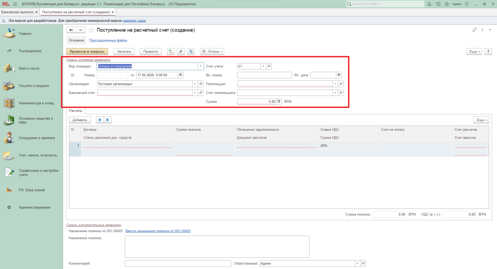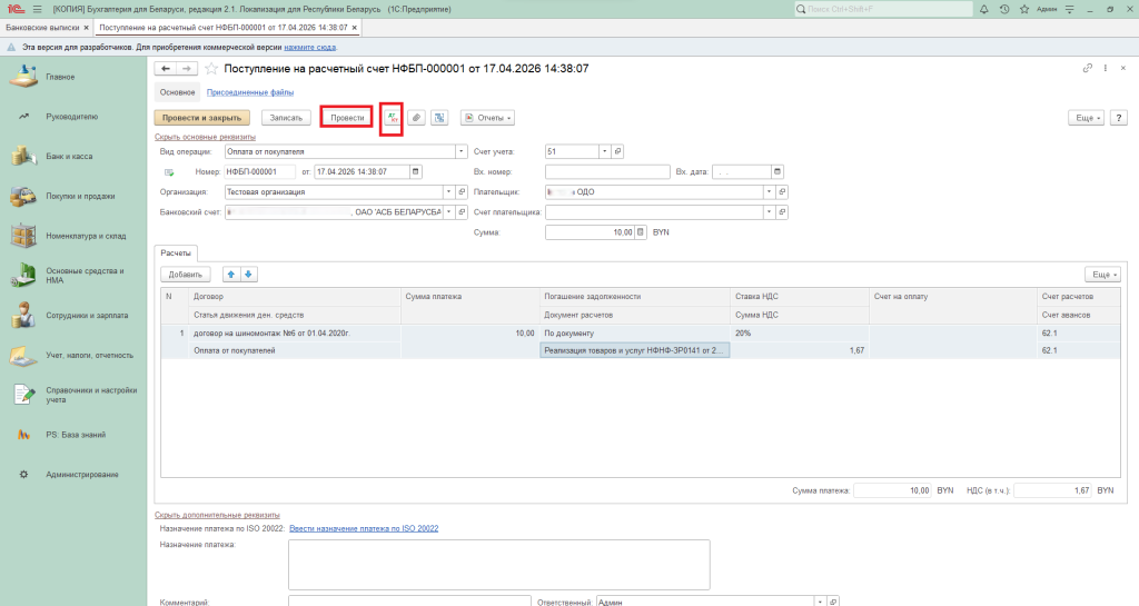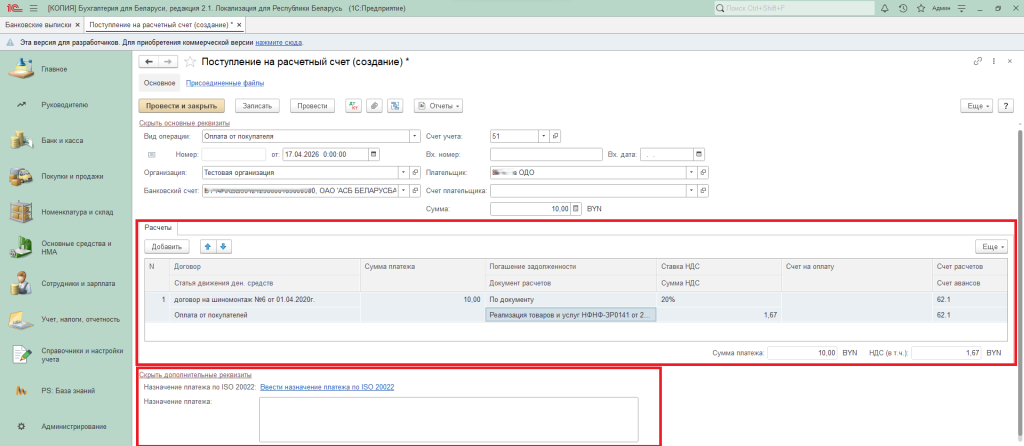 - Счет плательщика – счет, с которого поступила оплата (заполняется автоматически согласно информации из карточки контрагента);