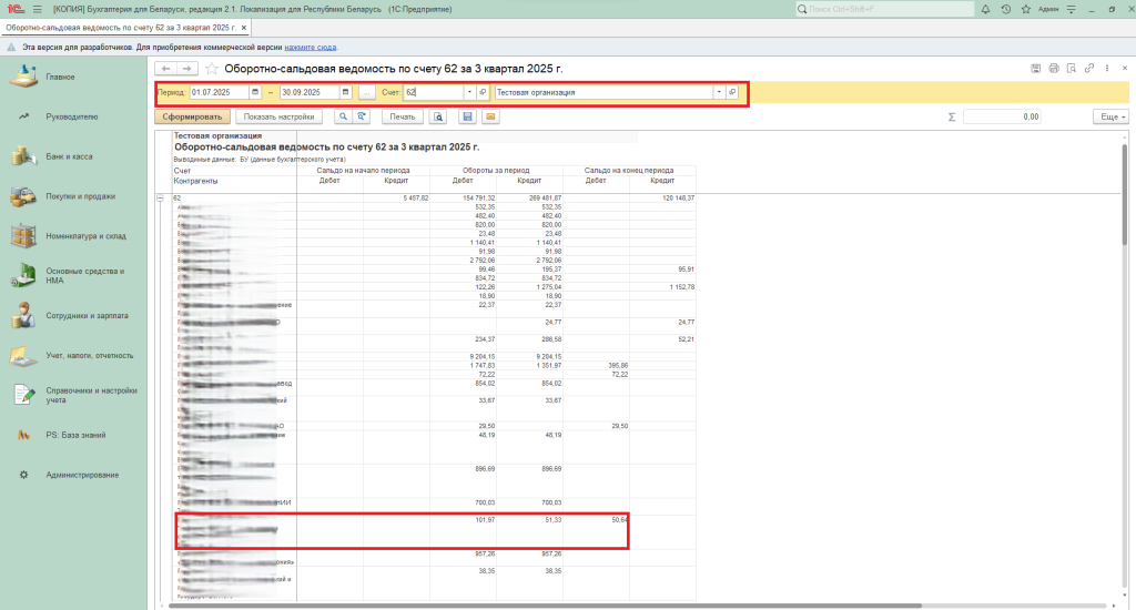 Выбираем период и счет 62 «Расчеты с покупателями и заказчиками». Нажимаем кнопку «Сформировать».