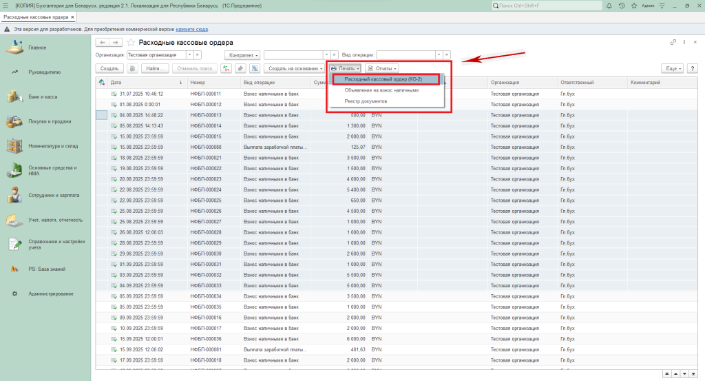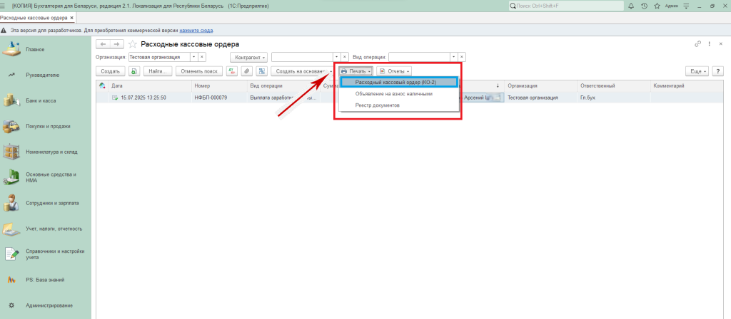 Далее также нажимаем «Печать» в списке выбираем «Расходный кассовый ордер (КО-2)».