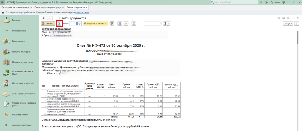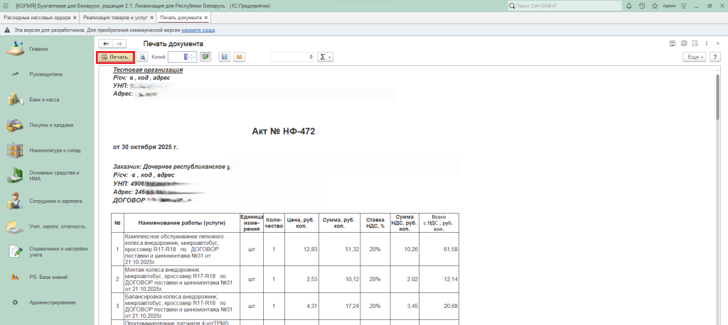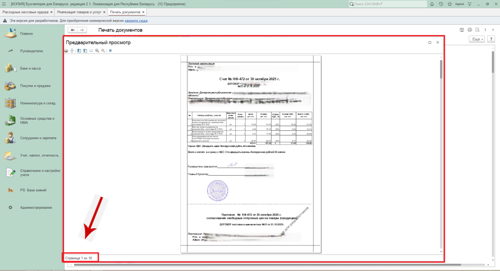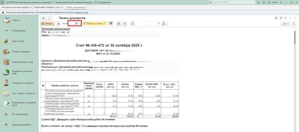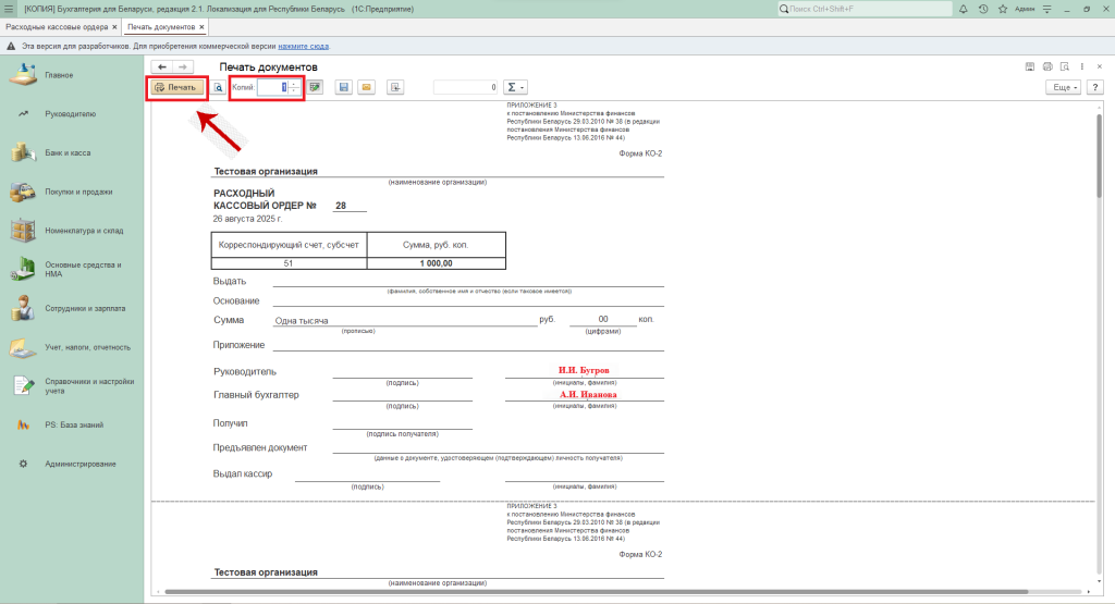 Далее откроется печатная форма документа, которая содержит все выделенные для печати документы. При необходимости можно поменять количество копий и нажимаем «Печать».