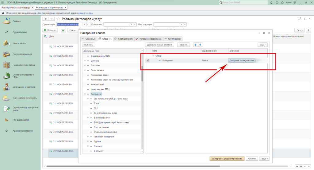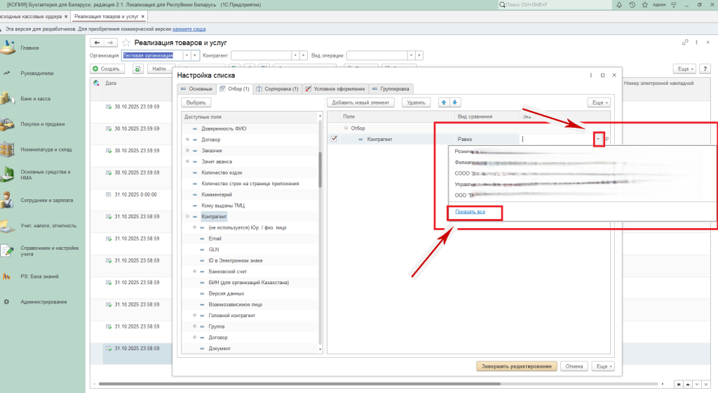 Заполнить «Значение» контрагента, для этого выбрать значок выпадающего списка и нажать «Показать все».