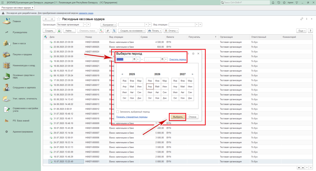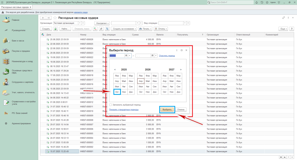 - можно установить период равный календарному месяцу, нажав кнопку, соответствующую этому месяцу. И далее нажать кнопку «Выбрать».