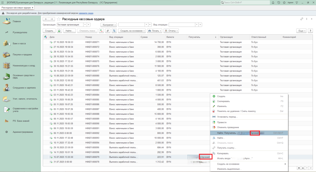 Нажимаем на этот документ правой кнопкой мыши и нажимаем на «Найти: Получатель – «Наш получатель»;
