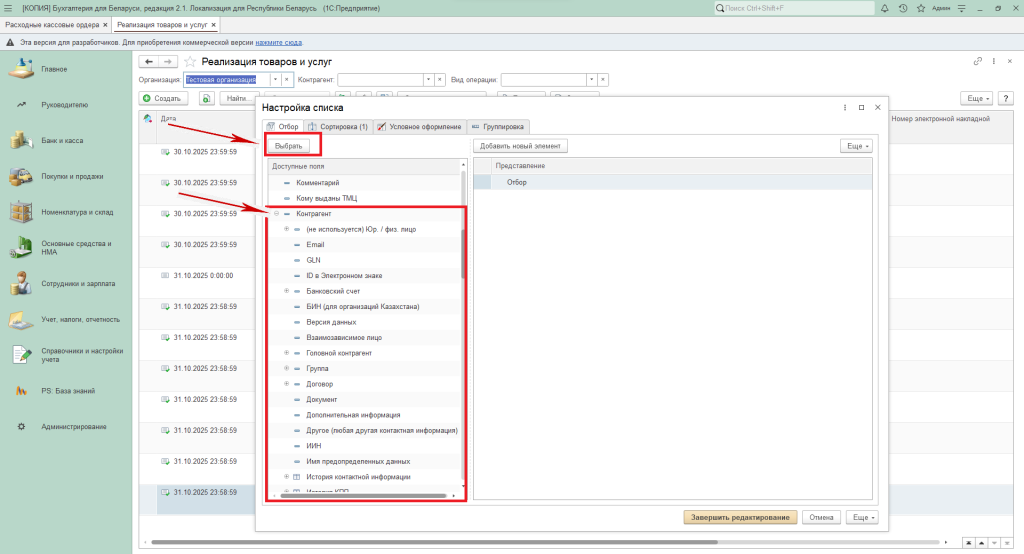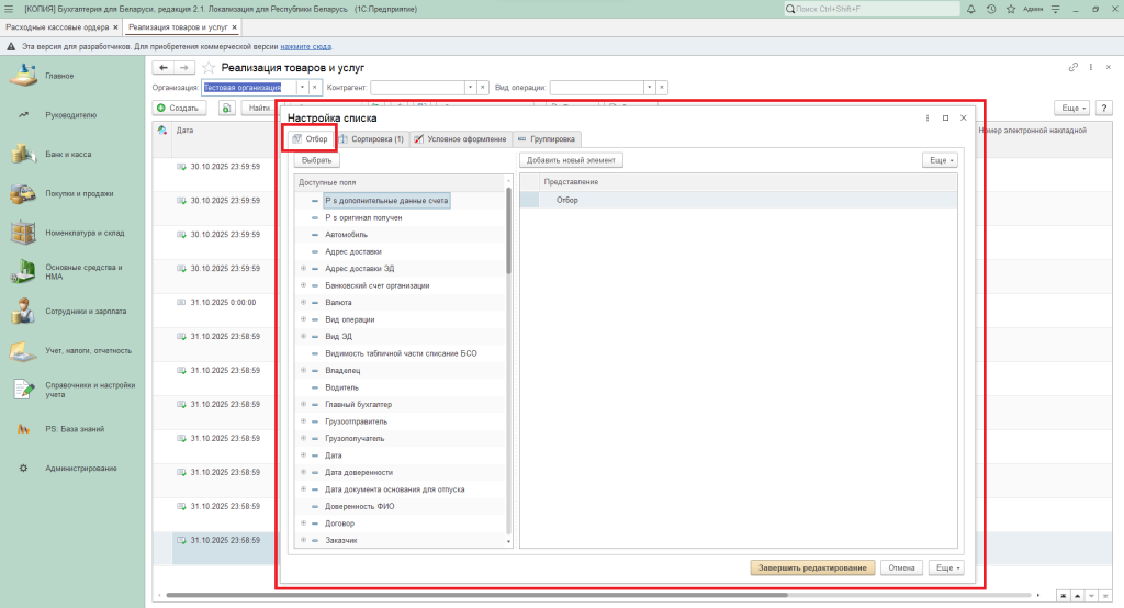Чем больше параметров будет добавлено в список, тем более точно сформируются нужные документы для отбора. Для завершения формирования списка нажать «Завершить редактирование».