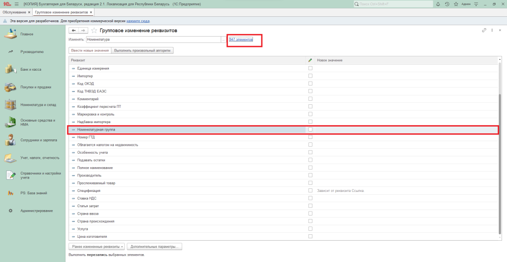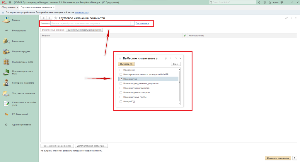 Поскольку справочник номенклатуры способен насчитывать тысячи позиций, требуется явно выбрать конкретные элементы, в которых будут изменены реквизиты.
