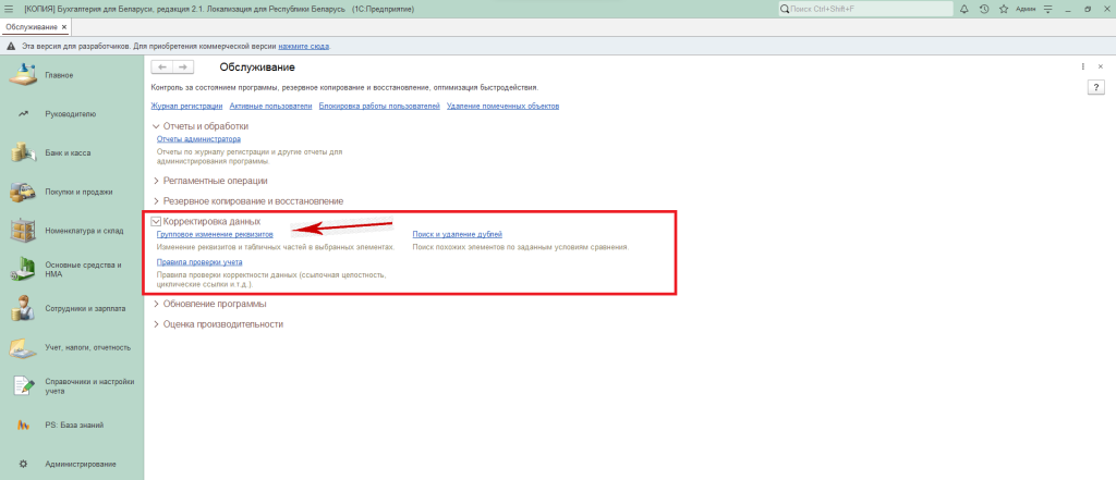«Корректировка данных» — «Групповое изменение реквизитов».