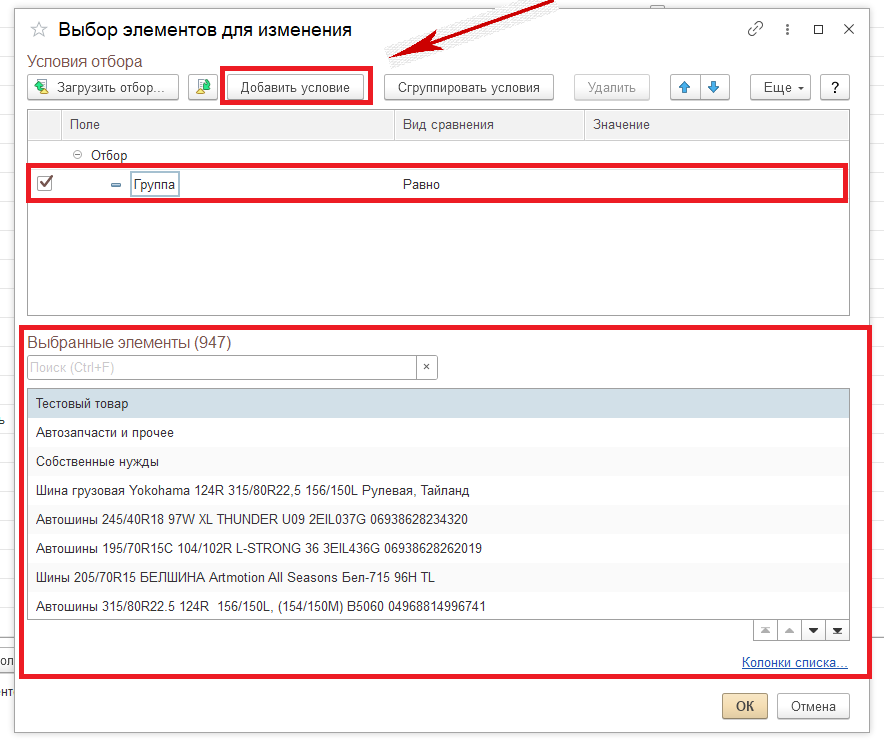Появится форма отбора, в которой с помощью кнопки «Добавить условие» зададим нужные критерии. После применения отбора в нижней части окна отобразятся входящие в данную группу элементы с указанием их общего числа.