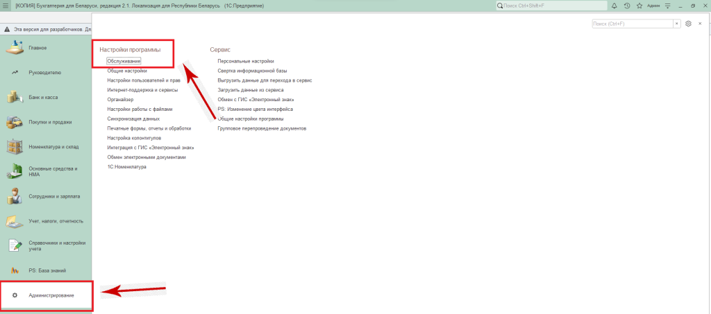 «Администрирование» — «Настройки программы» — «Обслуживание».