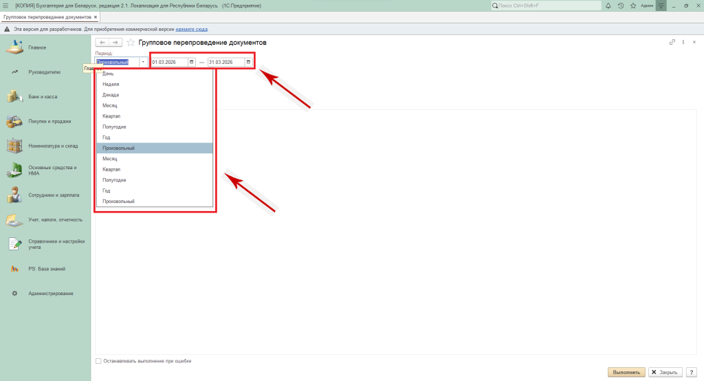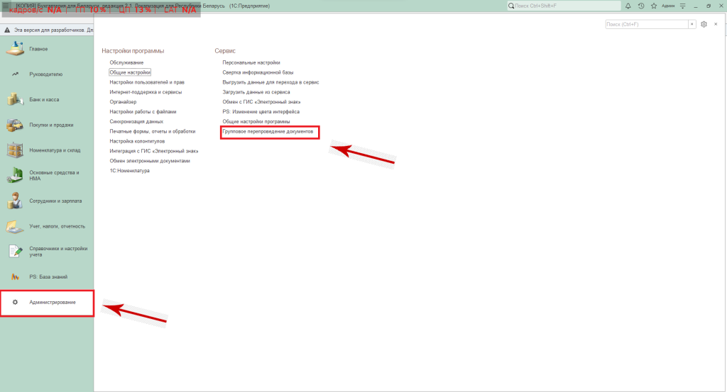 В программе реализована данная возможность, для этого необходимо зайти в раздел «Администрирование» → «Групповое перепроведение документов».