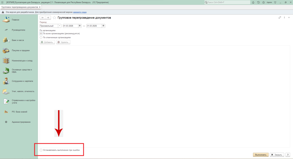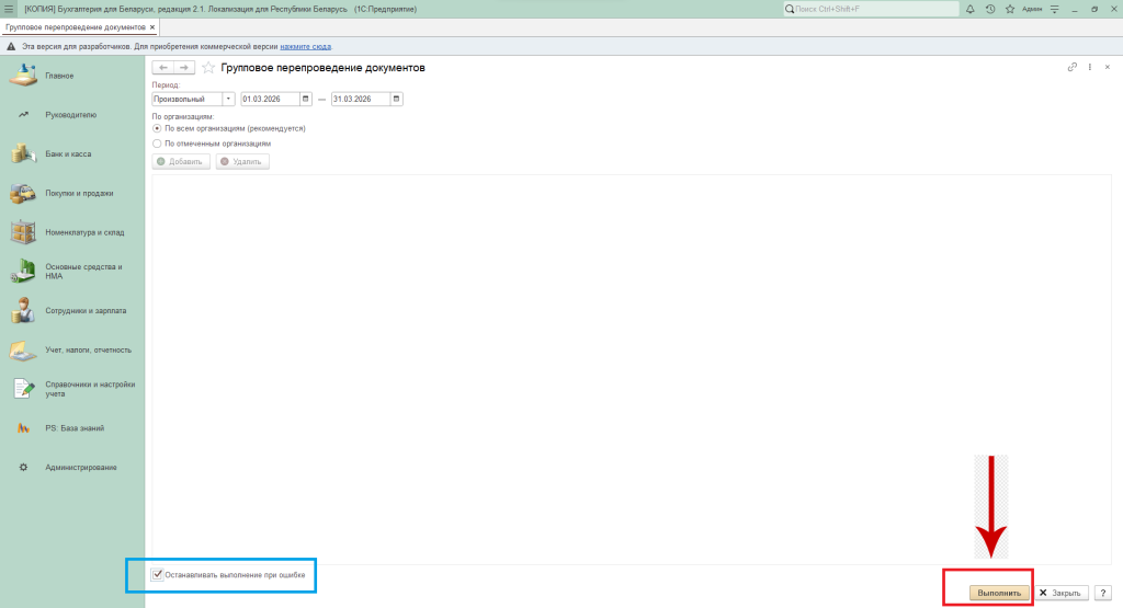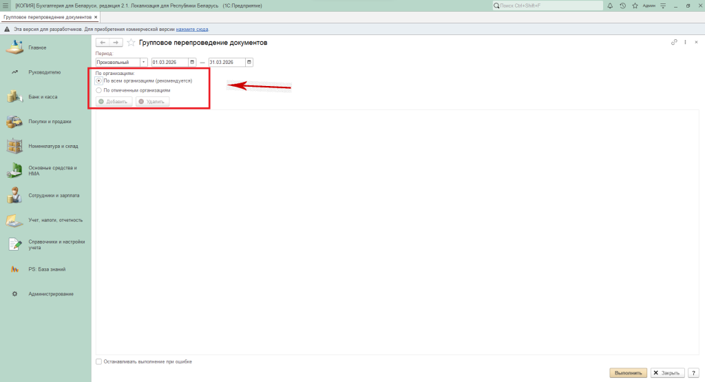 Перепровести документы можно по всем либо по выбранным организациям, если в базе их несколько.