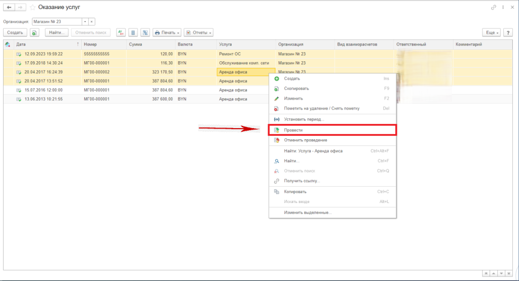 После выбора списка документов нажмите правую клавишу и нажимаем «Провести».