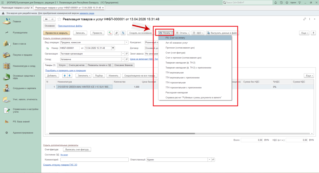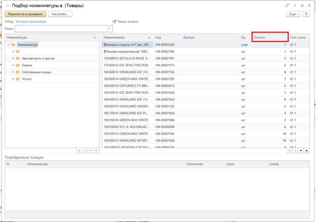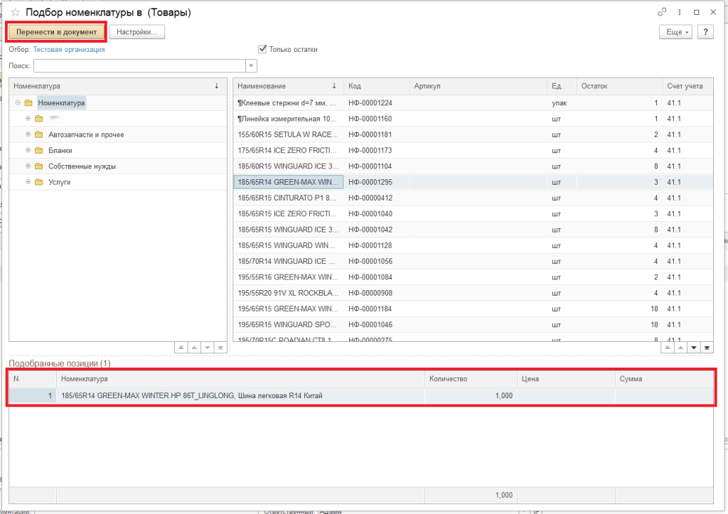 Внизу формы отражается выбранная номенклатура. Нажать кнопку «Перенести в документ».