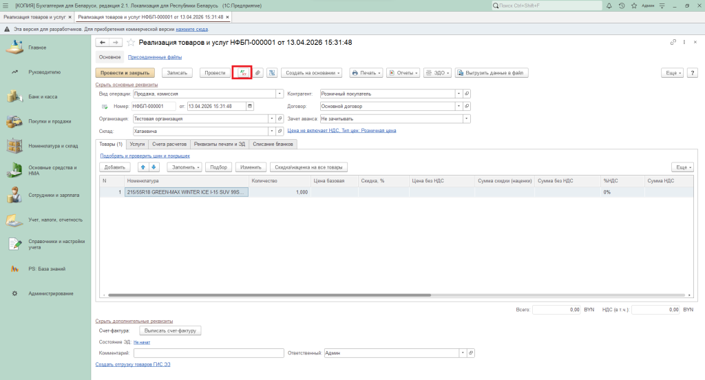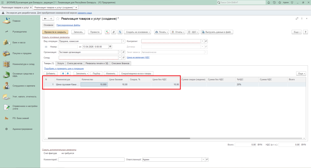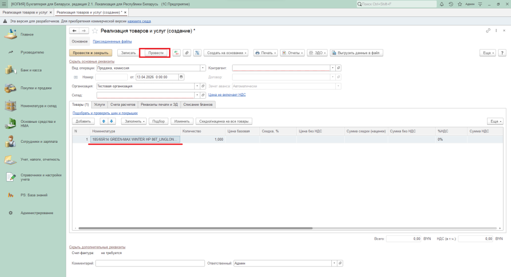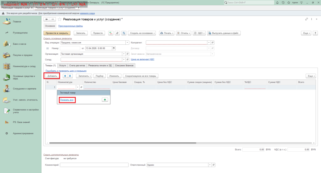 Нажать на кнопку «Добавить» и указать номенклатуру.
