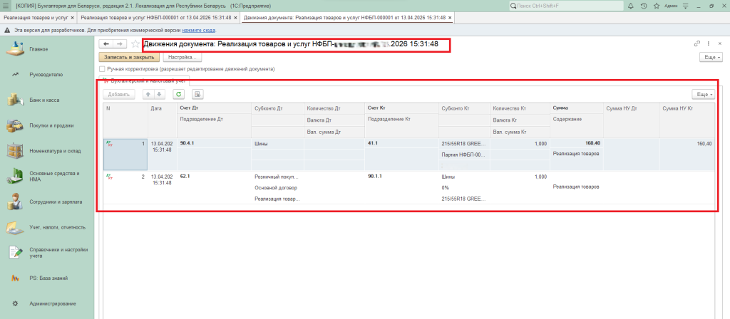 На основе заполненных данных создаются проводки. Посмотреть их можно нажав на кнопку «Показать проводки и другие движения документа».