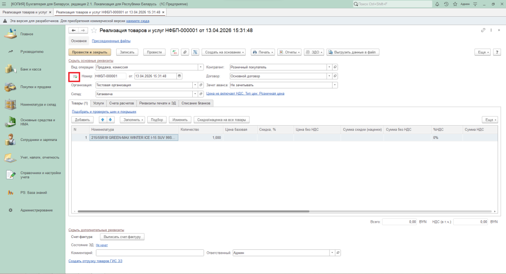 Номенклатура будет заполнена по выбранному поступлению. Количество проставится автоматически по данным документа «Поступление товаров и услуг».