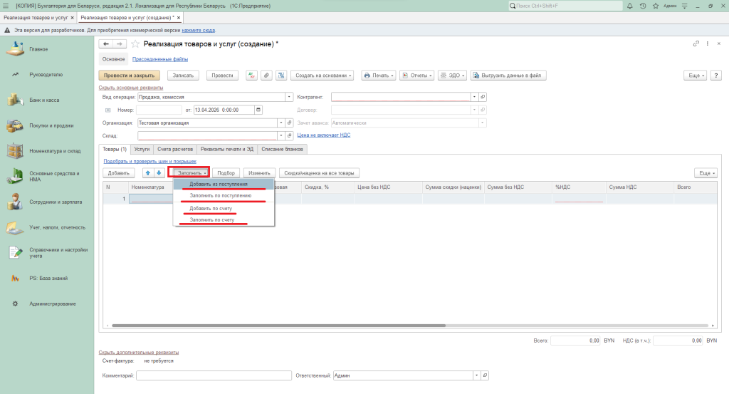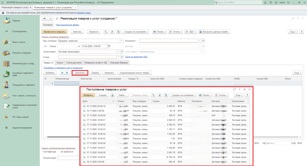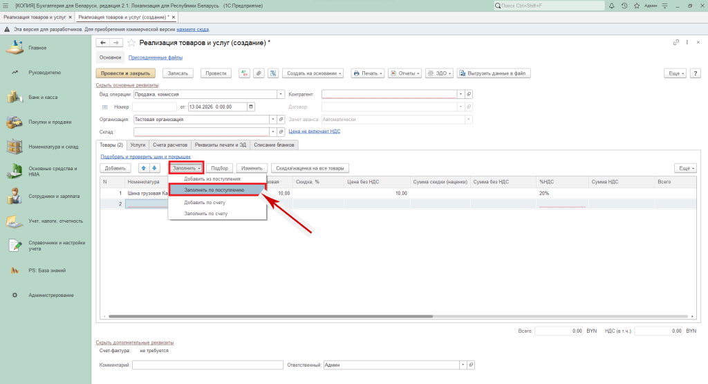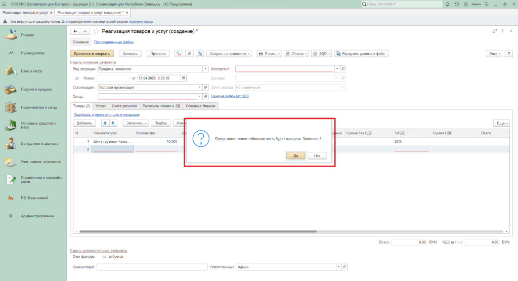 - Заполнить из поступления - если в табличной части уже была номенклатура, то при выборе данного варианта информация будет очищена. Перед этим появится предупреждение.