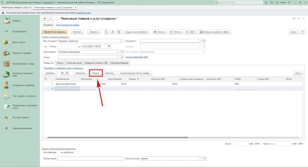 Необходимо нажать на кнопку «Подбор», выбрать номенклатуру, указать количество и цену.