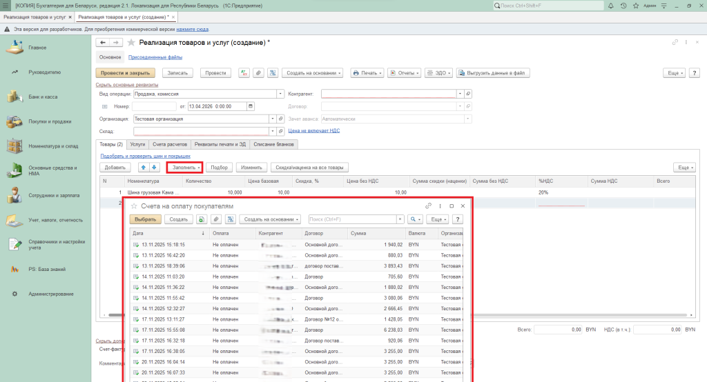 Откроется список «Счета на оплату покупателям». Выбрать нужный счет на оплату. Программа сама заполняет документ «Реализация на основании выбранного счета».