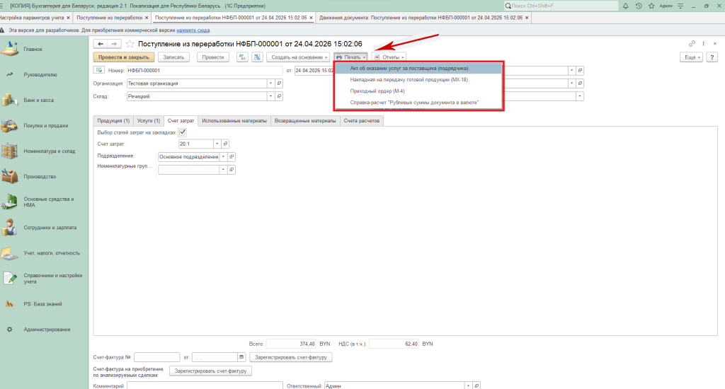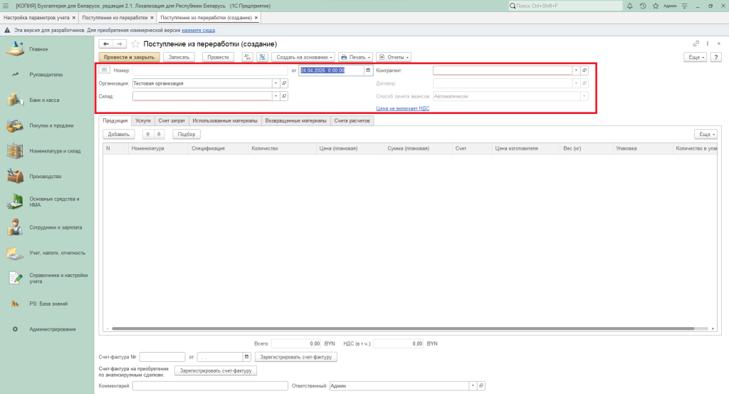 Продукция, выпущенная переработчиком и поступившая на склад, отражается в документе по плановым ценам. Её фактическая себестоимость определяется только при закрытии месяца.