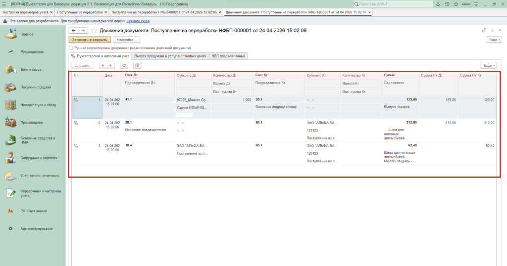 При проведении документа в бухгалтерском учёте формируются проводки: все расходы на переработку сырья относятся в дебет счёта затрат, а поступление переработанной продукции отражается по дебету счёта 41.1 «Товары».