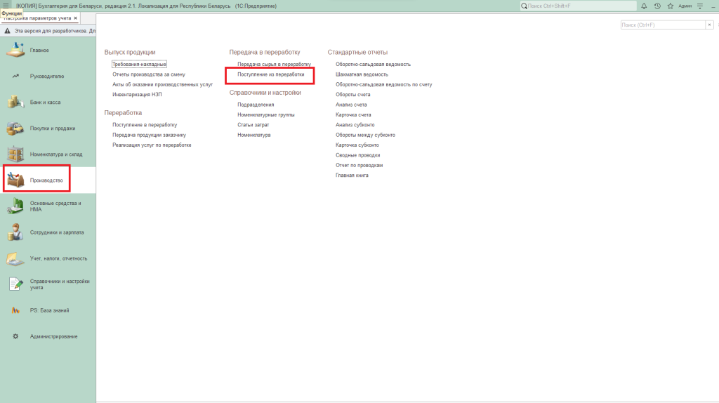 Себестоимость готовой продукции у переработчика формируется из двух составляющих: стоимости сырья, отданного в переработку, и стоимости самих услуг по переработке. Эти затраты аккумулируются на счете 20 в разрезе подразделений и номенклатурных групп. Для отражения операций по переработке сырья силами подрядчика предназначен документ «Поступление из переработки», который находится в разделе «Производство».