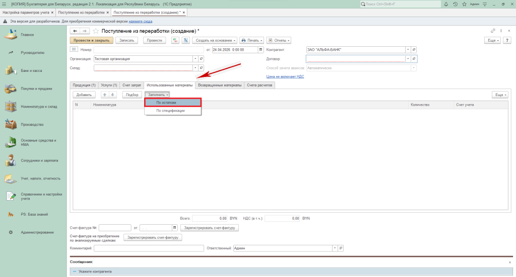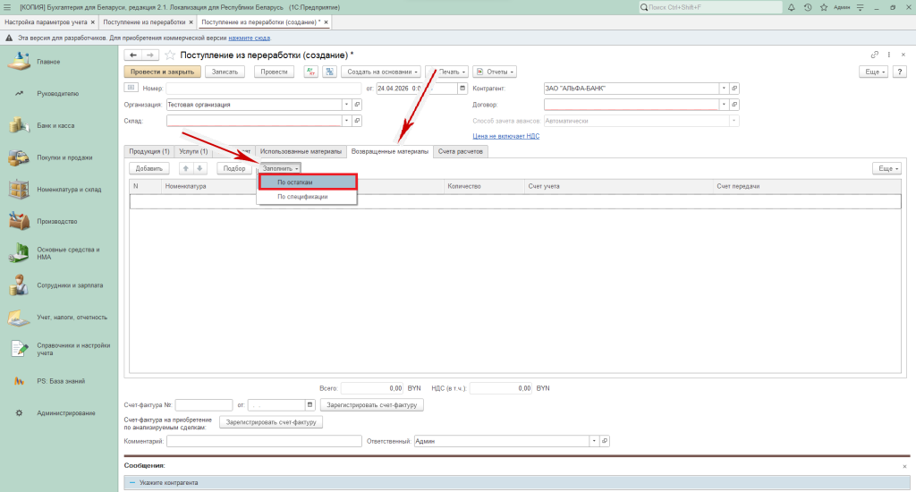 На вкладке «Возвращенные материалы» фиксируется поступление сырья, оставшегося неиспользованным в переработке и возвращённого организации. Табличную часть можно заполнить, нажав кнопку «Заполнить» и выбрав вариант «По остаткам либо по спецификации».