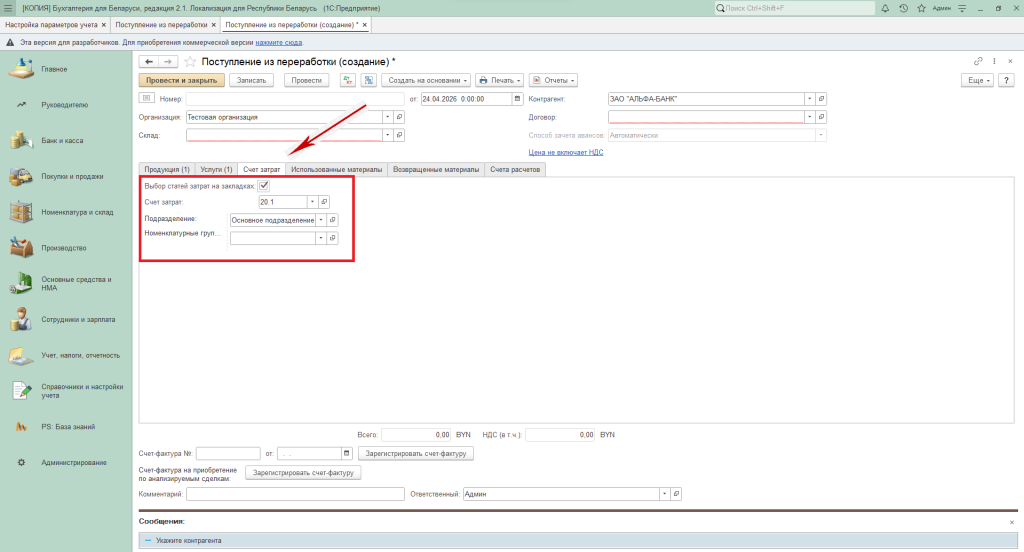 На вкладке «Счета расчетов» задаётся счёт затрат, на котором аккумулируются расходы на выпуск продукции переработчиком — это может быть счёт 20.1 «Основное производство» или 23 «Вспомогательные производства». Здесь же следует указать подразделение и номенклатурную группу.
