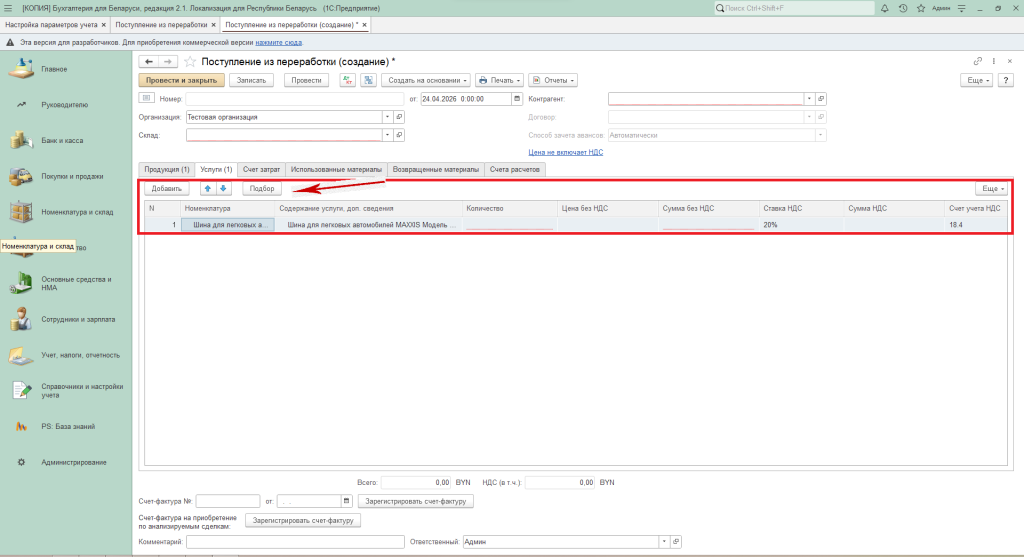 На вкладке «Услуги» фиксируется стоимость услуг переработки. Табличную часть здесь заполняют через кнопку «Подбор», выбирая позицию из справочника «Номенклатура».