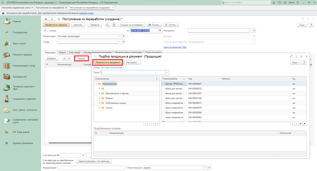 На вкладке «Продукция» отображается готовая продукция, полученная из переработки. Чтобы заполнить табличную часть, нажмите кнопку «Подбор» и выберите нужную позицию из справочника «Номенклатура».