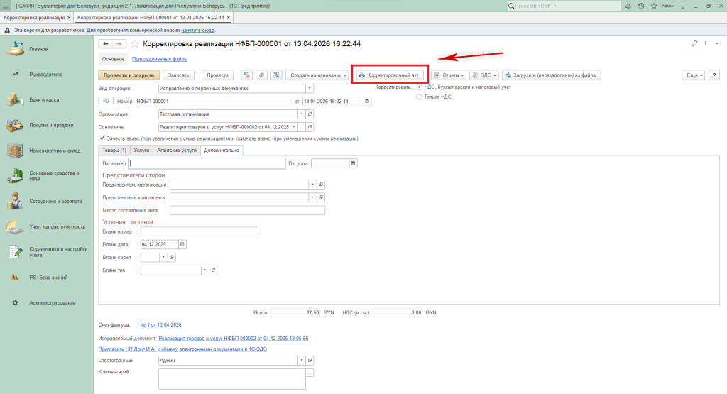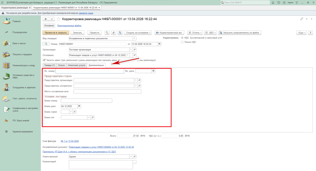 Каждая корректировка должна оформляться первичным учётным документом – корректировочным актом. Для заполнения данных для корректировочного акта необходимо заполнить данные на вкладке «Дополнительно»: