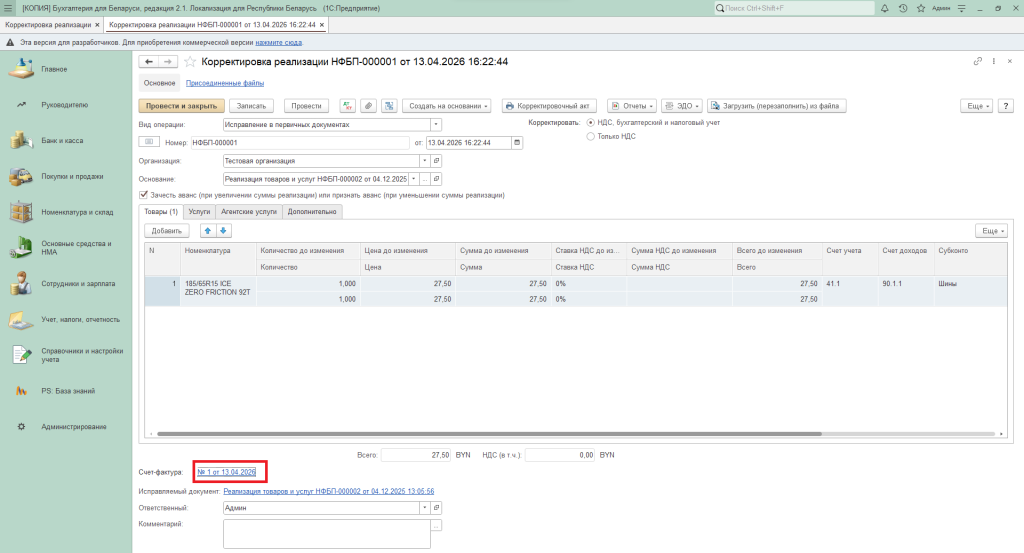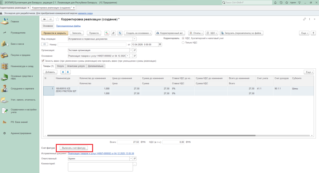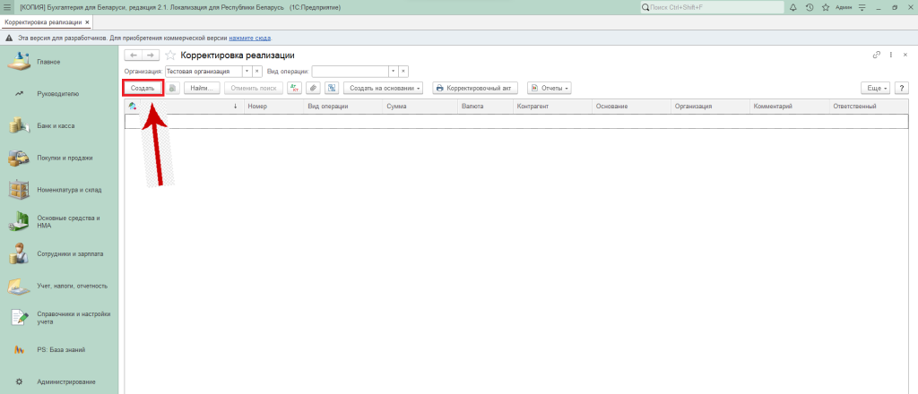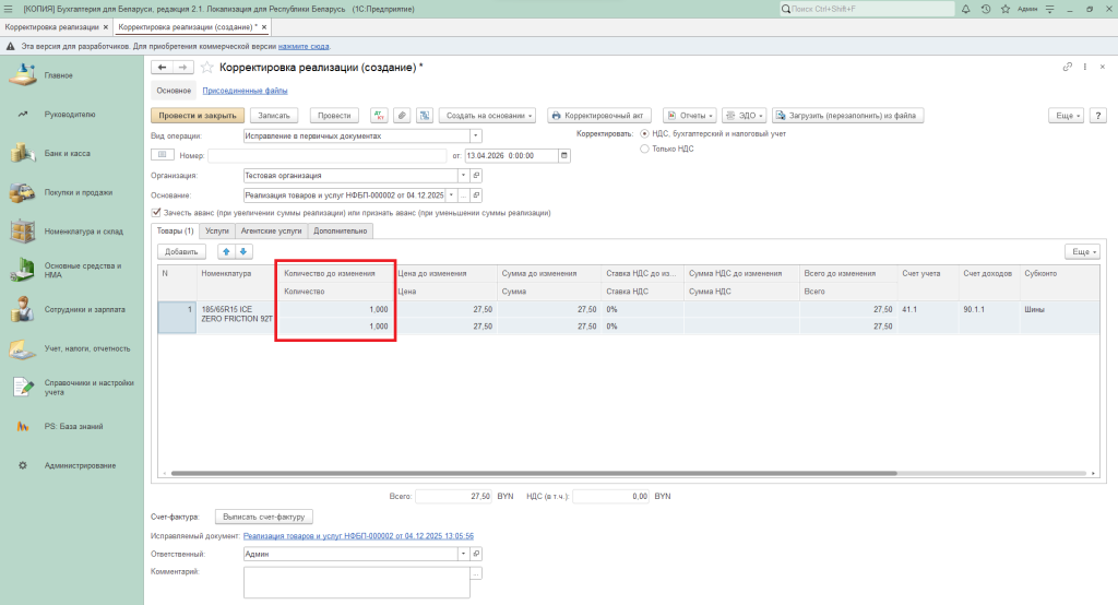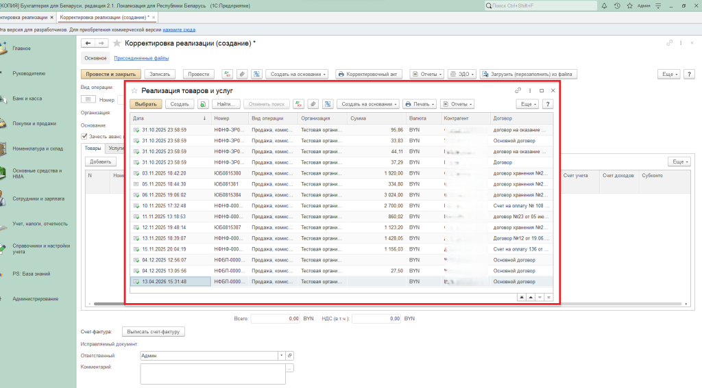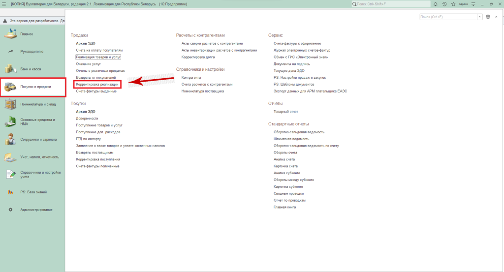 Корректировка реализации в 1С