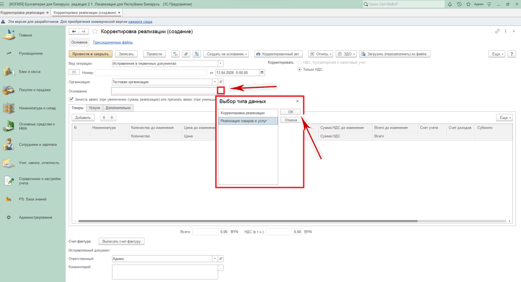 тип данных для корректировки: акт об оказании производственных услуг, корректировка реализации, отчёт комиссионера о продажах, реализация товаров и услуг;