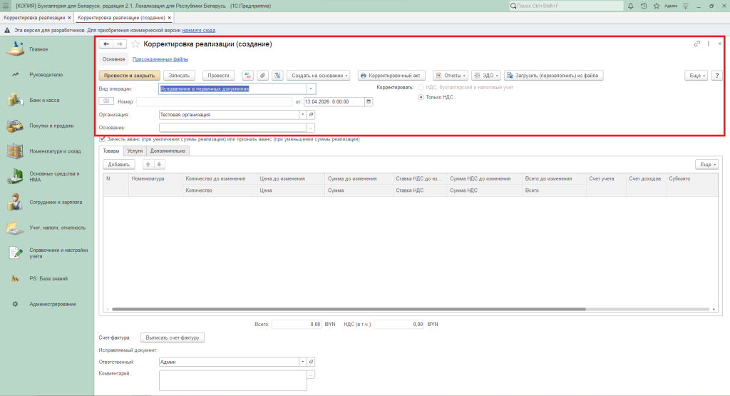 В табличной части следует указать, какие именно параметры корректируются (количество, цена, ставка НДС и т.д.). К примеру, если требуется изменить только количество реализованного товара, а цена остаётся прежней, программа автоматически пересчитает итоговую сумму.