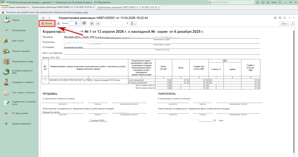 Для создания печатной формы корректировочного акта нажмите кнопку «Корректировочный акт».