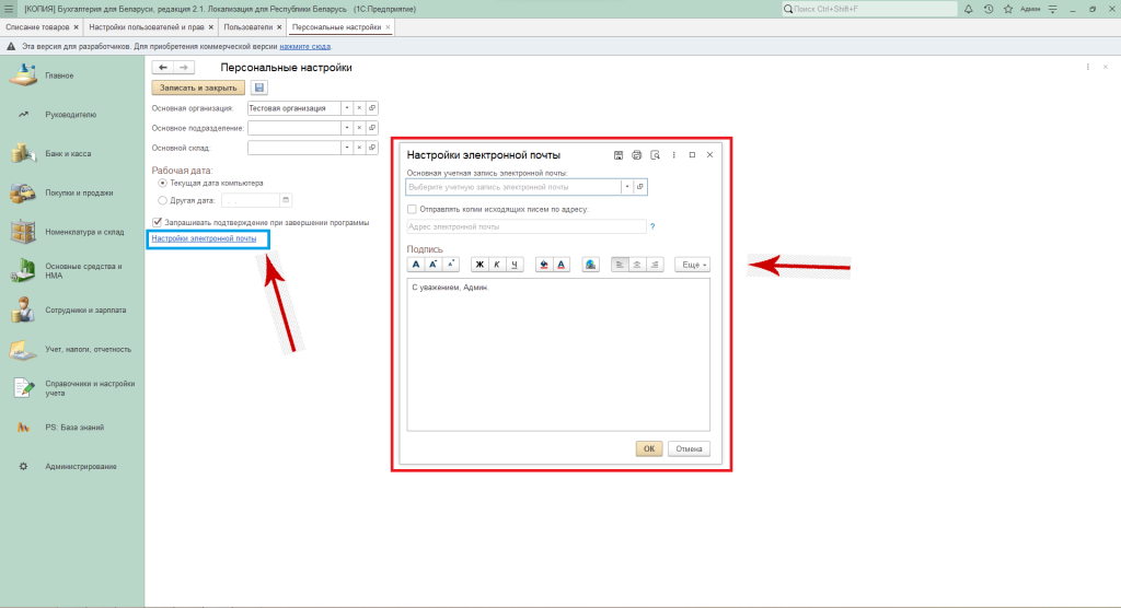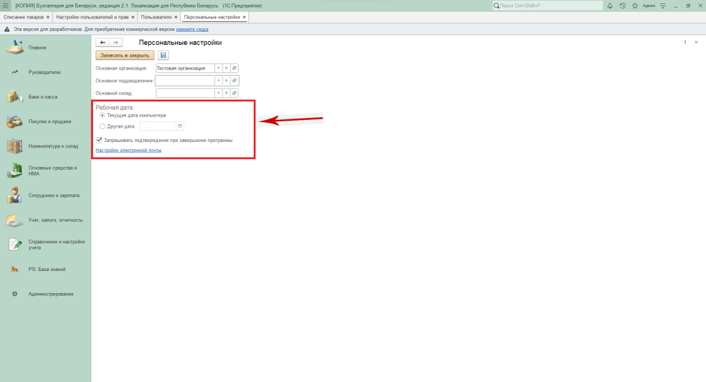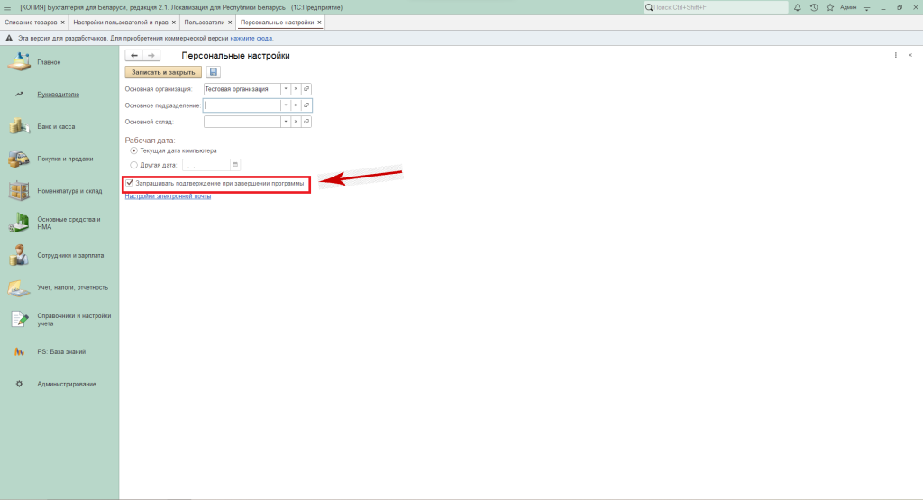 Персональные настройки пользователя в программе 1С Бухгалтерия