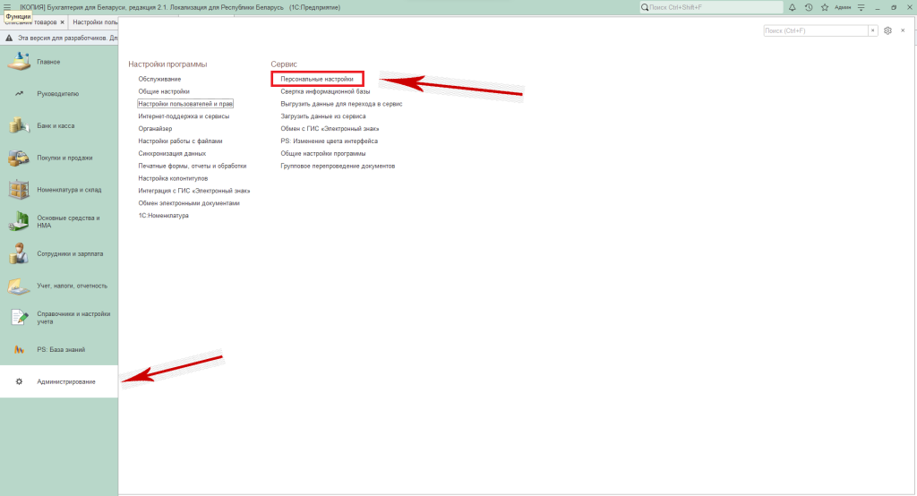 В 1С:Бухгалтерии можно настроить персональные параметры для каждого пользователя — это позволит автоматически подставлять некоторые значения в документы по умолчанию. Чтобы просмотреть или изменить такие настройки, откройте раздел «Администрирование» и выберите «Персональные настройки пользователя»