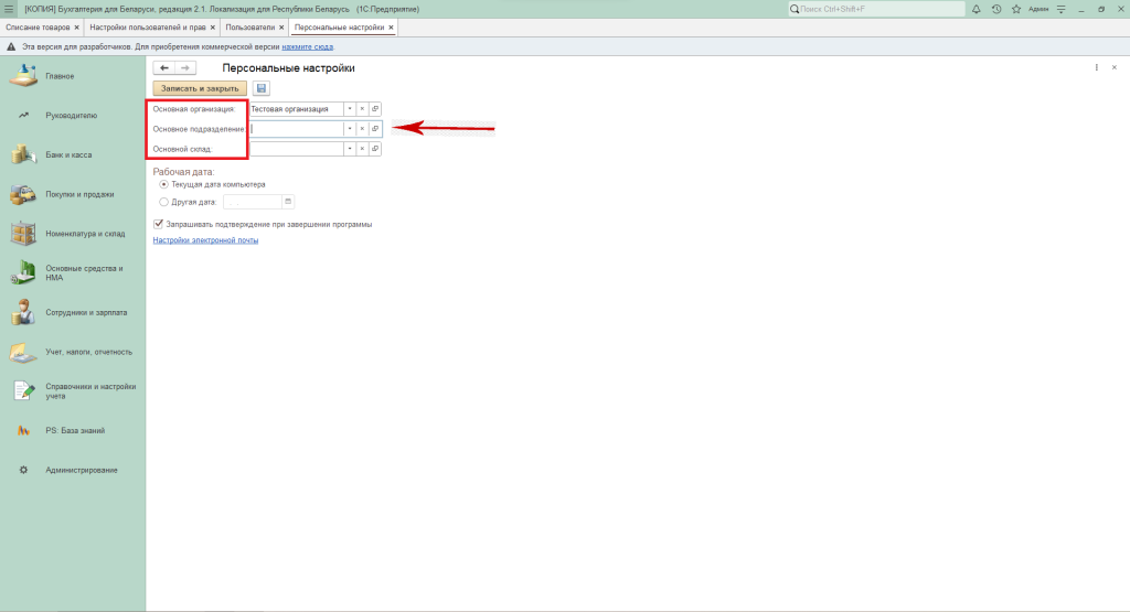 В открывшемся окне настроек можно задать основную организацию (если в одной базе ведётся учёт сразу по нескольким предприятиям), а также указать основное подразделение и основной склад.