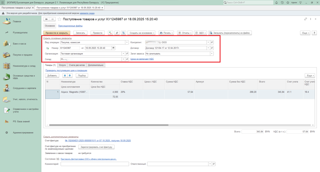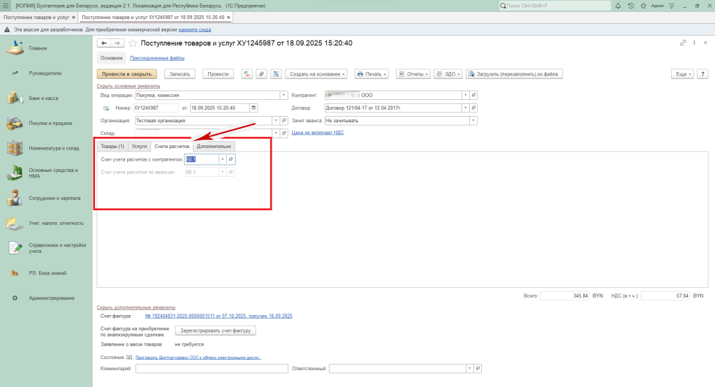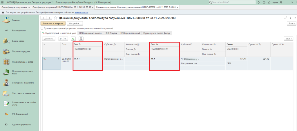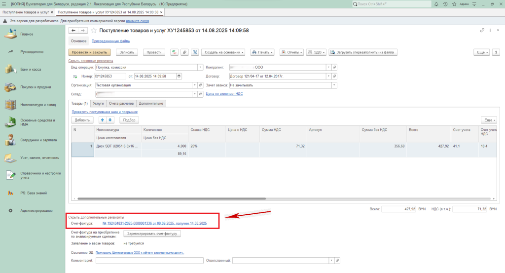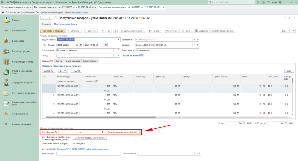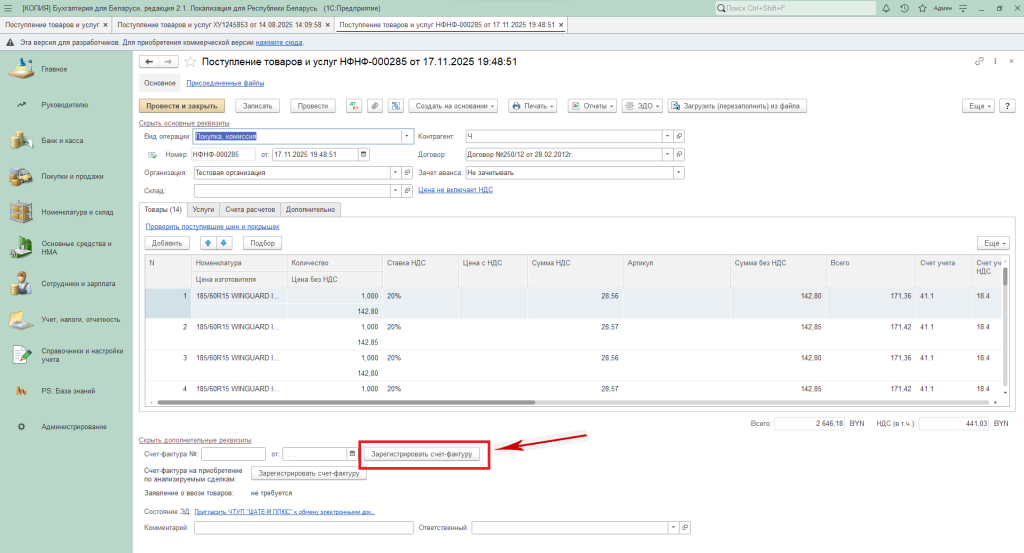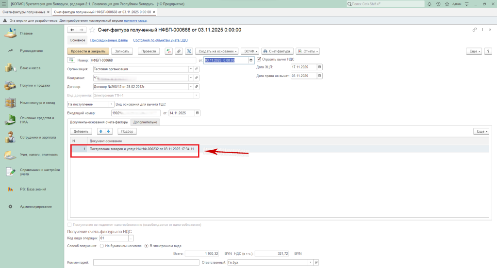 При нажатии на кнопку «Зарегистрировать счет-фактуру» автоматически создается и проводится «Счет-фактура полученный».