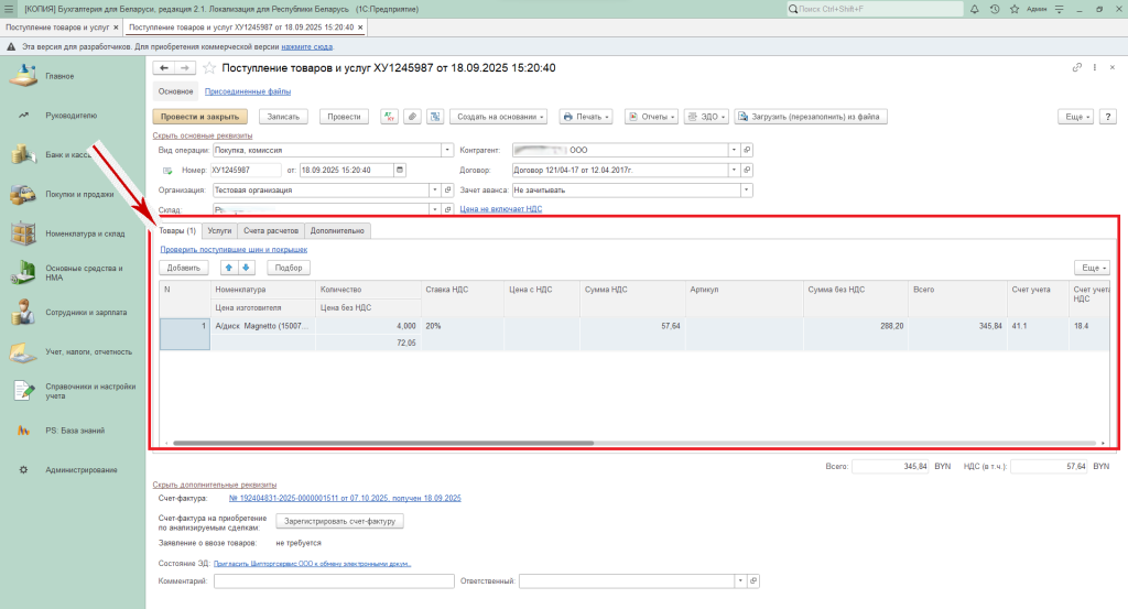 В табличной части, на вкладке «Товары», необходимо указать по каждому поступившему товару:
