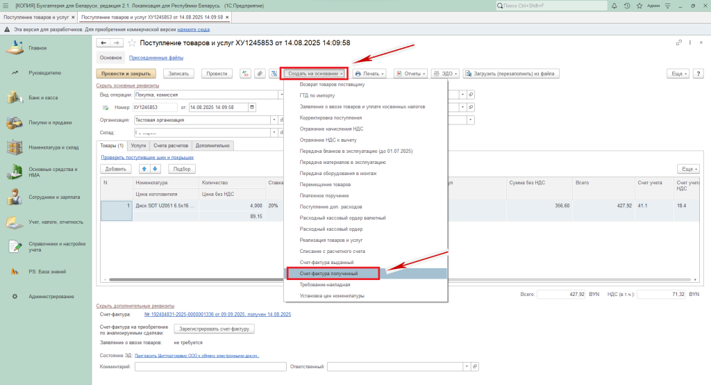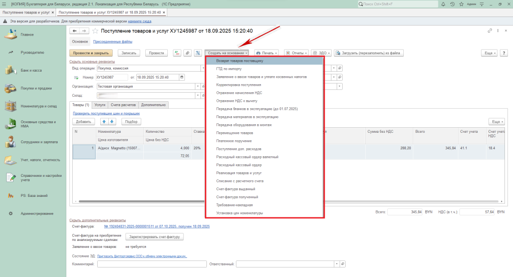В документе поступления нажимаем кнопку «Создать на основании» и выбираем нужный документ.