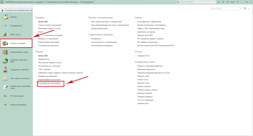 В разделе «»Покупки и продажи» выбираем пункт «Счета-фактуры полученные».