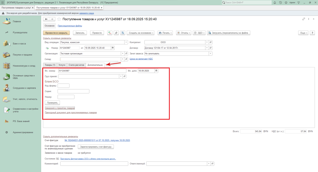 На закладке «Дополнительно» указываются номер и дата входящего документа.