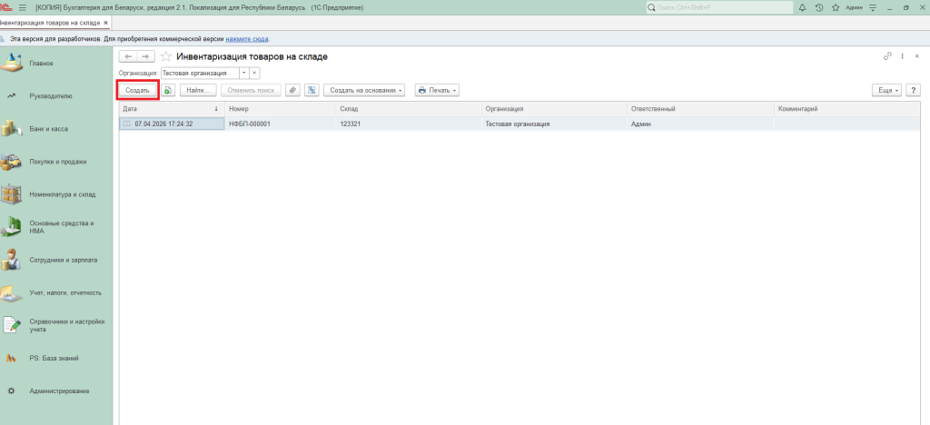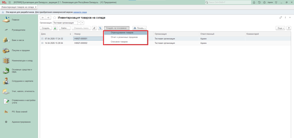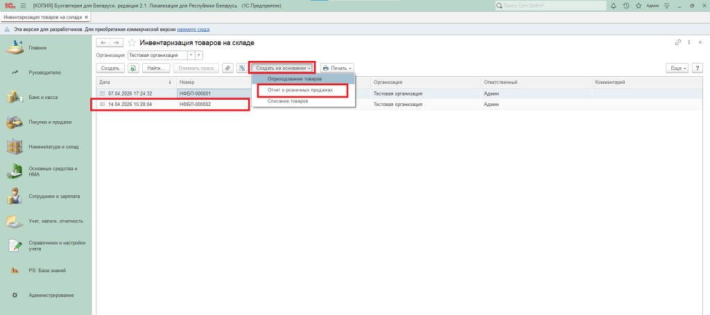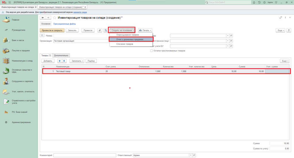 Сам по себе этот документ не порождает бухгалтерских проводок. Однако на основании результатов инвентаризации товаров можно сформировать документ «Отчёт о розничных продажах», нажав кнопку «Создать на основании».