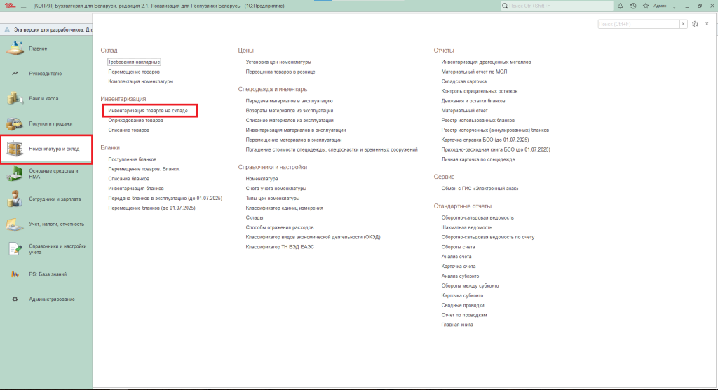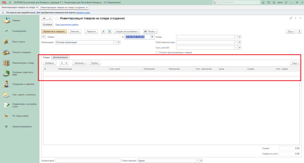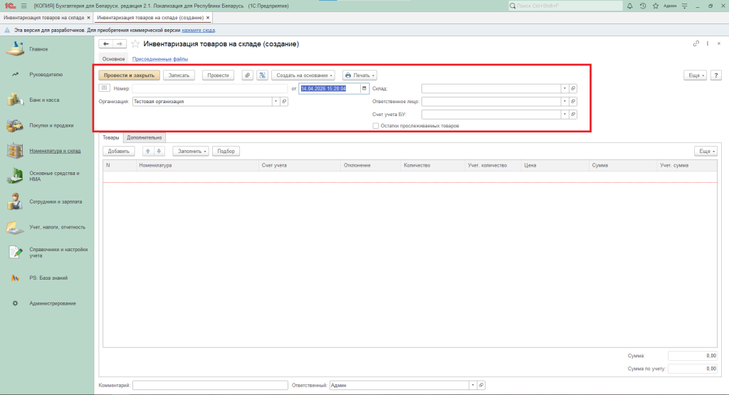 Чтобы установить перечень товаров, выбывших из неавтоматизированной торговой точки за определенный период, требуется периодически проводить инвентаризацию. В программе «1С:Бухгалтерия» эта процедура оформляется документом «Инвентаризация товаров на складе», расположенным в разделе «Номенклатура и склад».