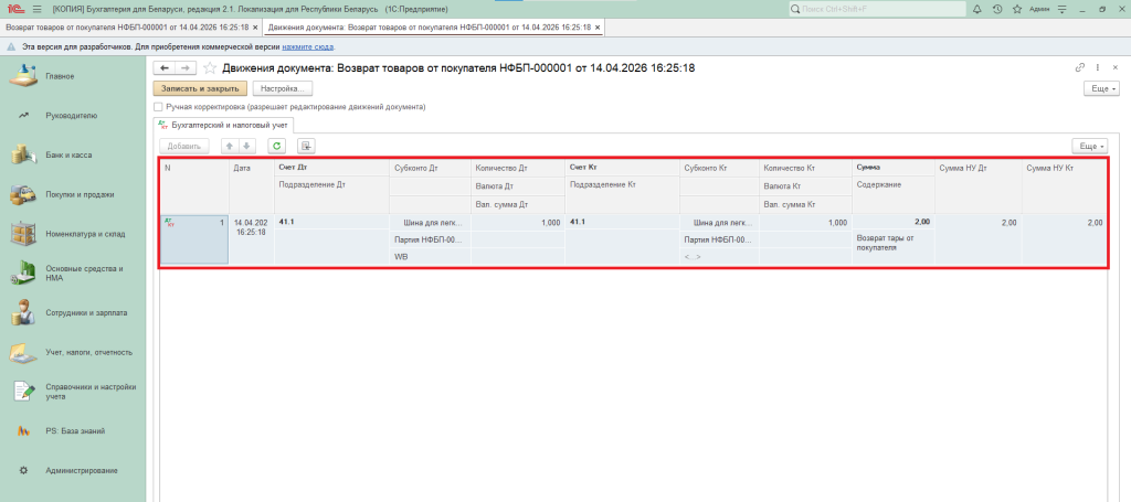 При формировании документа в бухгалтерском учёте будут сформированы следующие записи:
