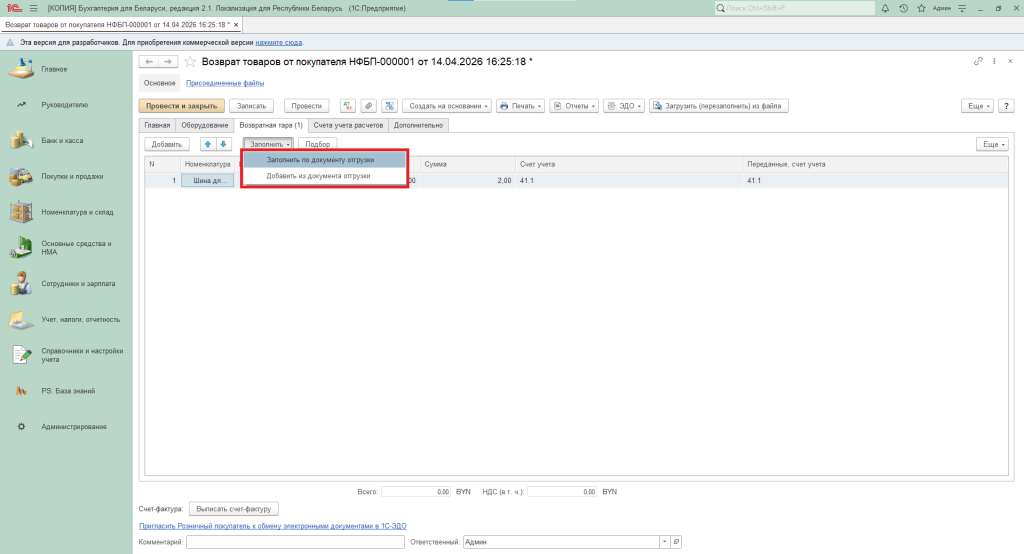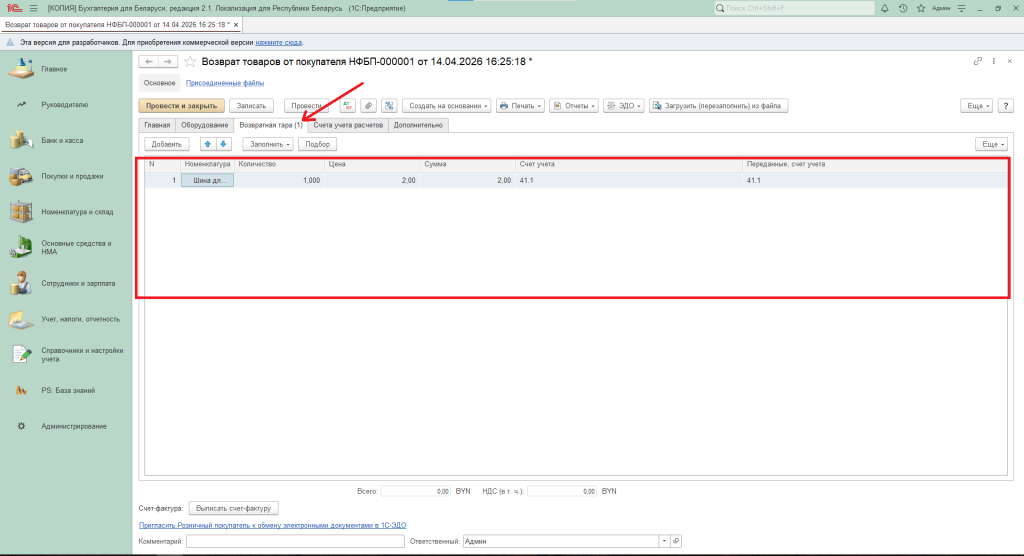 На закладке «Возвратная тара» из справочника «Номенклатура» выбрать возвратную тару, а также проставить количество, цену, сумма проставляется программой автоматически. Счёт учёта – 41.3 «Тара под товаром и порожняя».